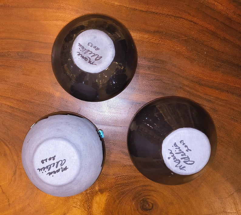 Experience the artistry of Maria Adelicia, an acclaimed potter from San Juan Pueblo, New Mexico, whose one-of-a-kind black pottery pieces embody elegance, symbolism, and tradition. Each handcrafted creation from her 2023 collection features a glossy black interior and an exterior in your choice of glossy or matte jet-black (onyx-like) finish. Adorned with Sleeping Beauty turquoise accents, these pieces radiate refined craftsmanship and spiritual balance.
